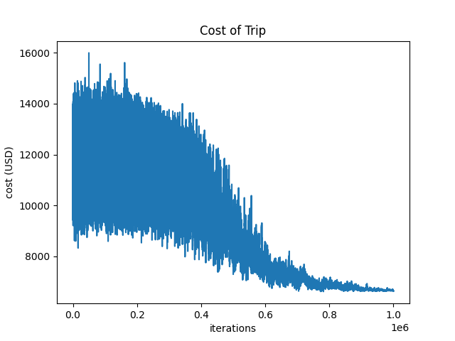 The algorithm will randomly swap a pair of airports to change the route and compare the results to the previous route. If the new paths do not have available flights, the new route is rejected. If the new route is cheaper, it is kept. If the new route is more expensive, it is rejected with some probability of keeping it, based on the relative difference in the two routes’ performance, as well as the temperature parameter.